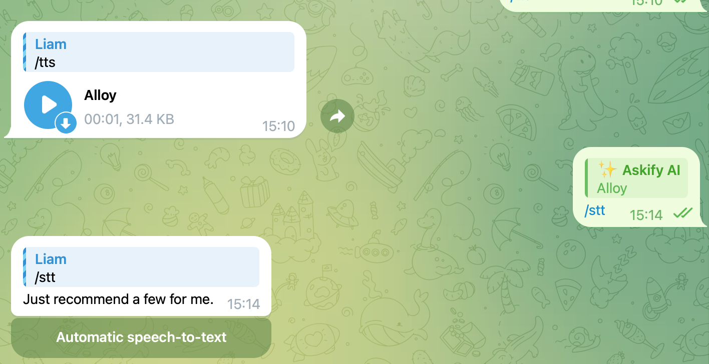 Use /stt in group chats or private messages to quickly turn voice messages into text. Just make sure to reply to the voice message when using the command.