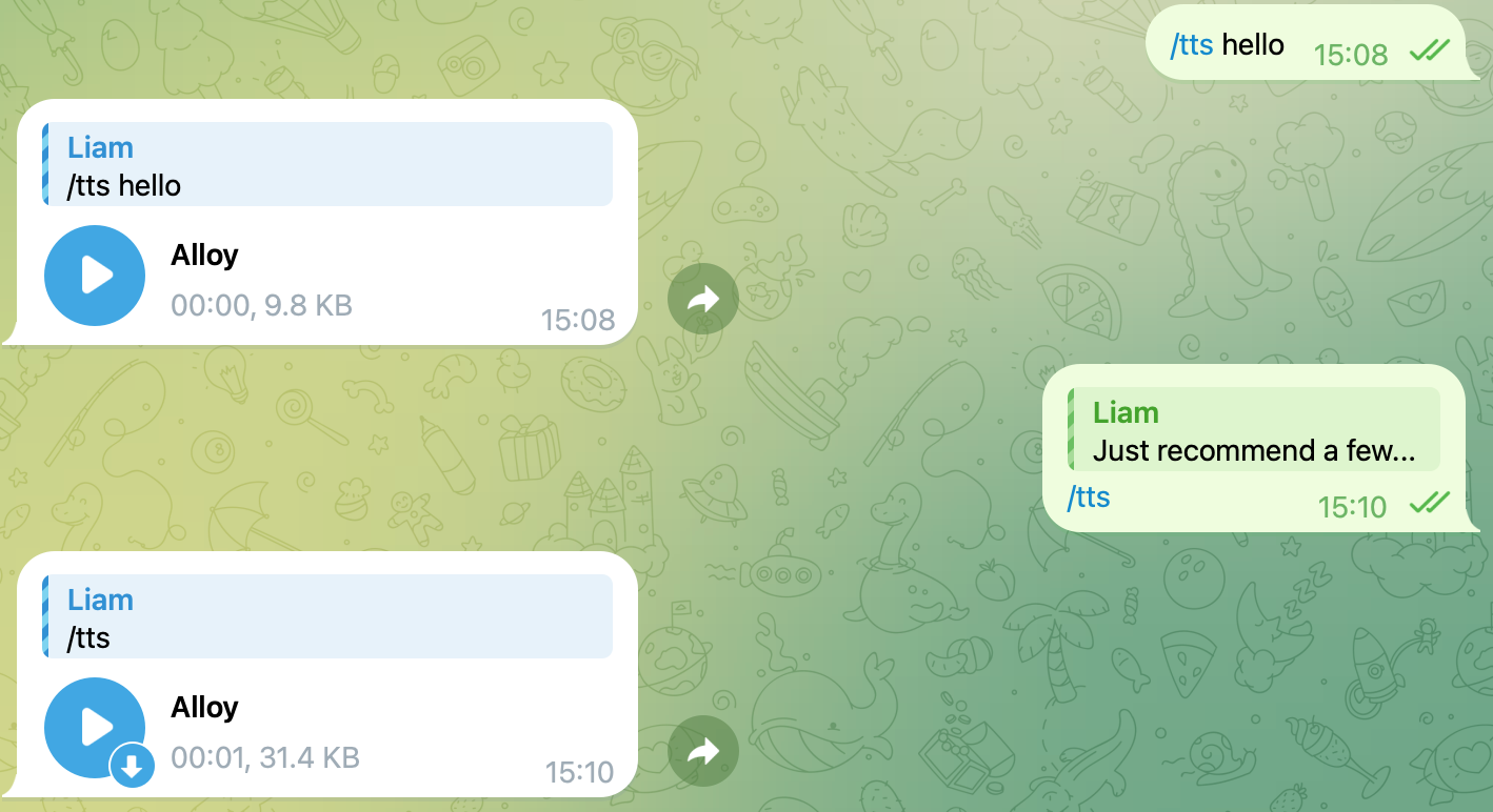 The /tts command can be used in both group chats and private messages to quickly convert text to speech.