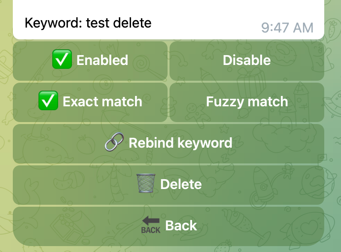 This feature is for group use. You can add any keywords. If a user sends related text in the group, the bot will automatically match and delete the message. You can set fuzzy match or exact match.
