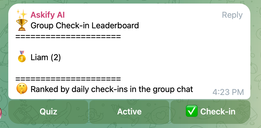 Tutorial - All FeaturesRankOn this pageRank You can use this command in the group to view the Q&A leaderboard, activity leaderboard, and check-in leaderboard. /rank