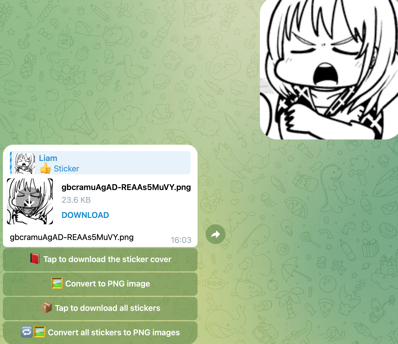 You can choose to download the cover image, export the full sticker pack as a ZIP, or convert individual stickers to PNG. The process is quick and easy.