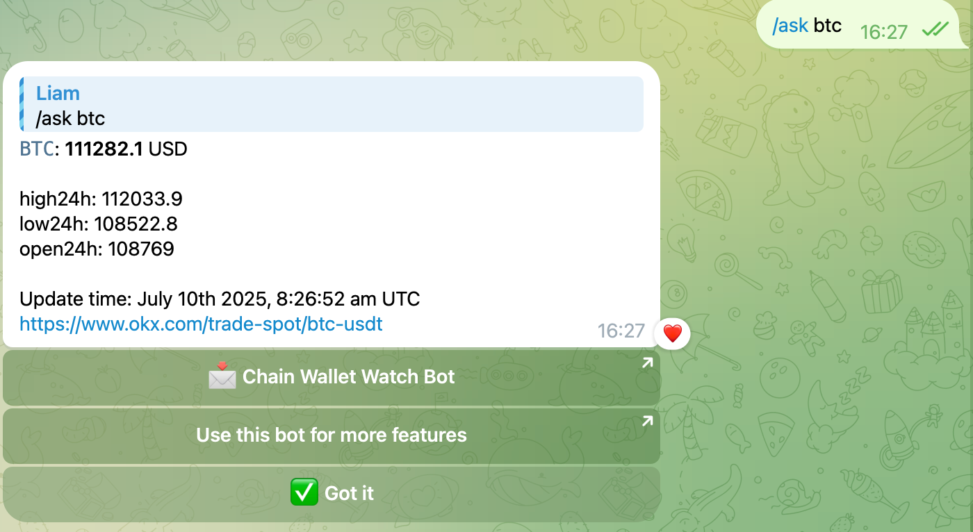 教程 - 全部功能币价查询本页总览币价查询 /cryptoprice 此命令可以查询全部实时币价 快速查询币价实时信息, 比如你想查询 BTC 的价格 在私聊窗口中, 只需要发送btc或者trx即可获取币价实时信息 如果你想在群组内进行使用, 请使用此命令: /ask btc