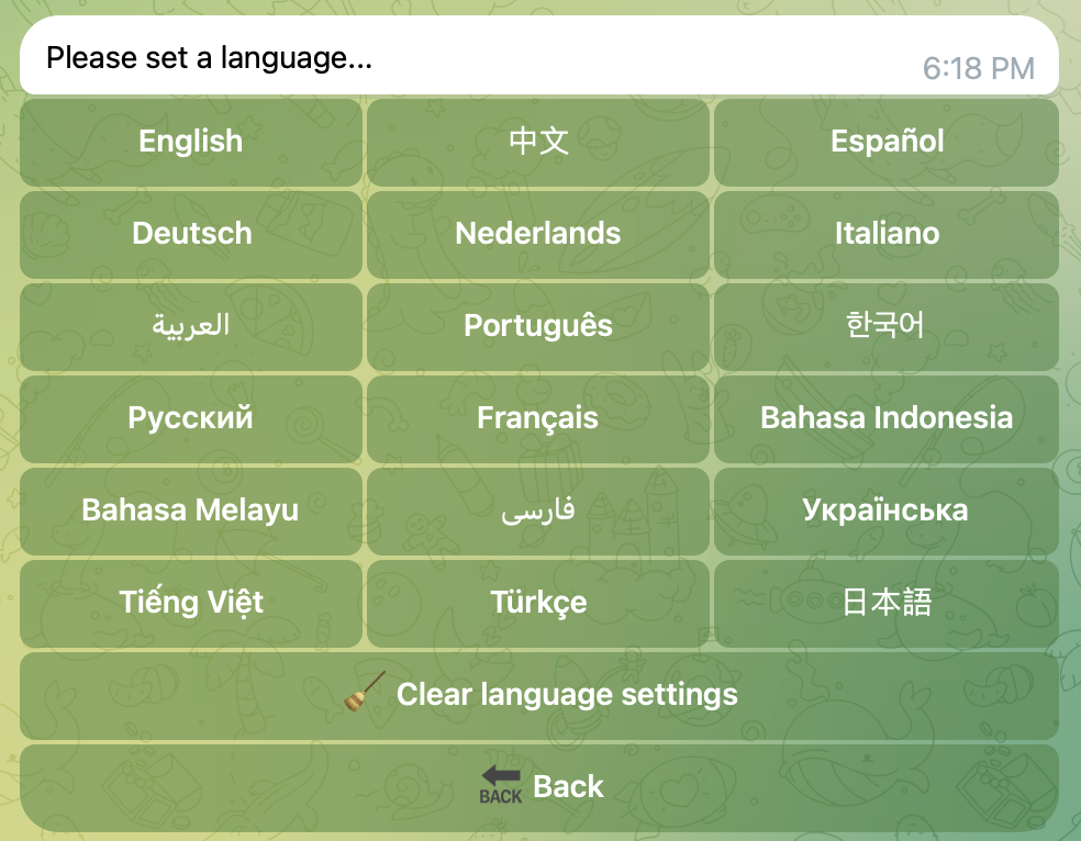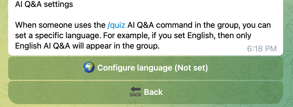 教程 - 全部功能管理您的频道或群组AI问答设置AI问答设置 AI Q&A settings 当有人在群内使用 /quiz AI问答命令的时候, 你可以设置专一语言, 比如你设置了英语, 那么群内只会出现英语的AI问答
